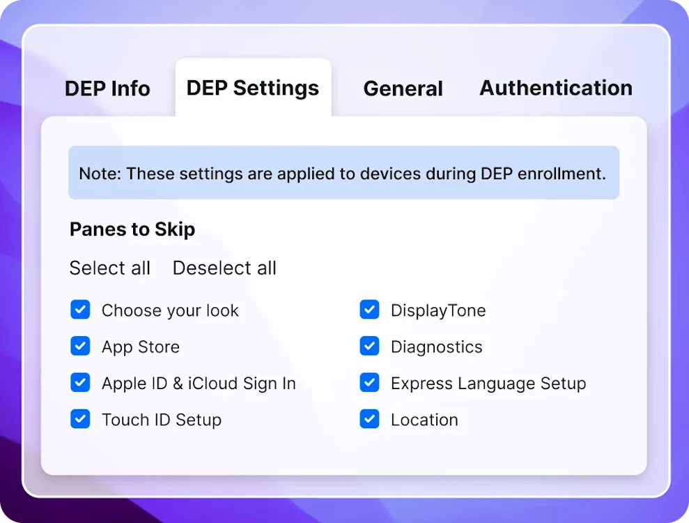 Rapidly enroll your entire fleet of Apple devices through automated enrollment. Set-up takes less than a minute per device, saving you hours.