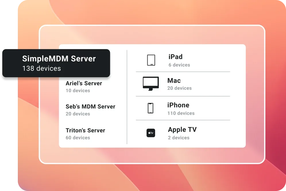 Apple devices can improve your business’s productivity, enhance your security, and keep your staff happy. And luckily, macOS, iOS, iPadOS, and tvOS devices contain frameworks to support Apple mobile device management (MDM). SimpleMDM leverages those frameworks to make maintaining Apple devices at scale quick, easy, and intuitive.
