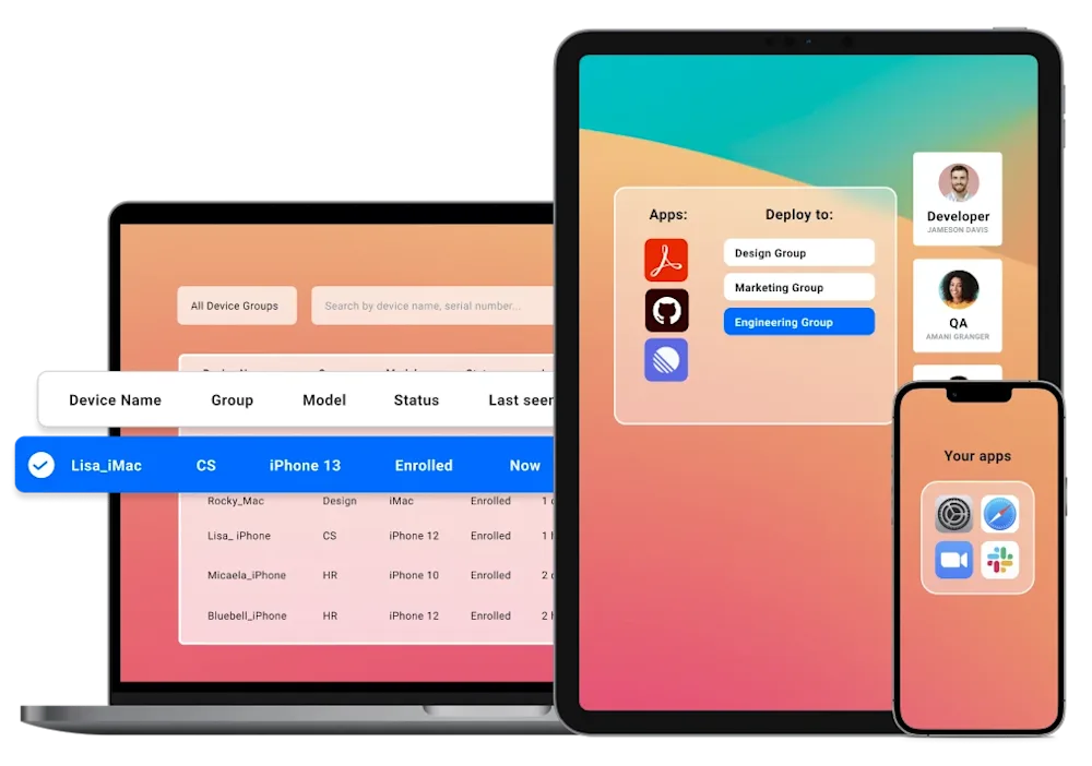 Our integration with Apple Business Manager simplifies device enrollment by automatically linking devices purchased from Apple or an authorized reseller to your ABM account. Customize the setup experience with your organization's details, automatically install assigned apps, and deploy configurations upon activation.
